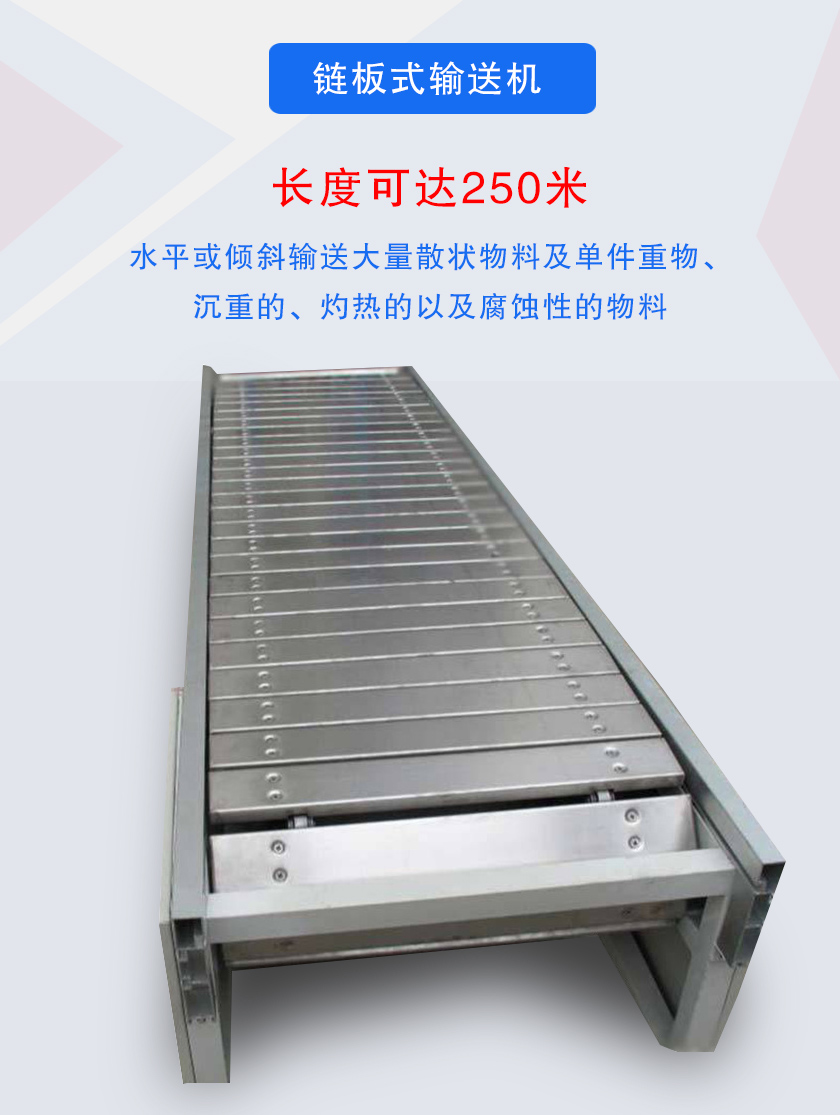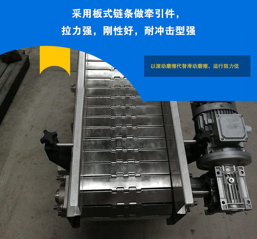 2、采用板式鏈條做牽引件,拉力強(qiáng),剛性好,耐沖擊型強(qiáng)。