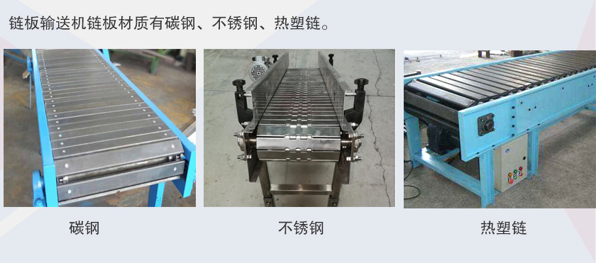 鏈板式輸送機(jī)簡稱鏈板輸送機(jī),屬于板式輸送機(jī)的一種,采用鏈條帶動槽板運(yùn)動而輸送物料,具有輸送能力大,動力消耗低,磨損小,工作可靠等優(yōu)點(diǎn),可以水平或傾斜輸送大量散狀物料及單件重物,尤其適用于大塊的、沉重的、灼熱的以及腐蝕性的物料。鏈板輸送機(jī)鏈板材質(zhì)有碳鋼、不銹鋼、熱塑鏈、我們可以根據(jù)您的需要為您設(shè)計(jì)不同寬度、形狀的鏈板。