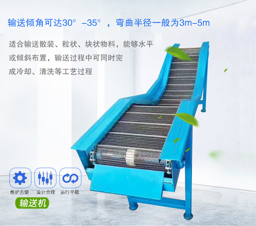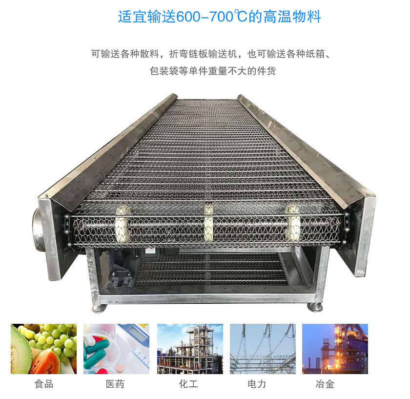 鏈板輸送機(jī)采用鏈板輸送帶180°鏈板輸送機(jī)用于銜接,與其他輸送設(shè)備配合使用能充分節(jié)省空間并能起到良好的輸送效果。轉(zhuǎn)彎角度可分:60°、90°、180°。可輸送的物料種類繁多,既可輸送各種散料,折彎鏈板輸送機(jī),也可輸送各種紙箱、包裝袋等單件重量不大的件貨,廣泛應(yīng)用于食品、醫(yī)藥、化工、電力、冶金等行業(yè),適宜輸送600-700℃的高溫物料。