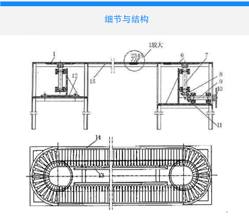 鏈條:板式鏈條做牽引件,運(yùn)行平穩(wěn),維修率低。
