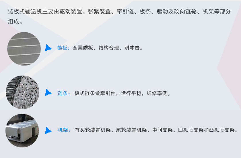 鏈板式輸送機(jī)主要由驅(qū)動裝置、張緊裝置、牽引鏈、板條、驅(qū)動及改向鏈輪、機(jī)架等部分組成。
