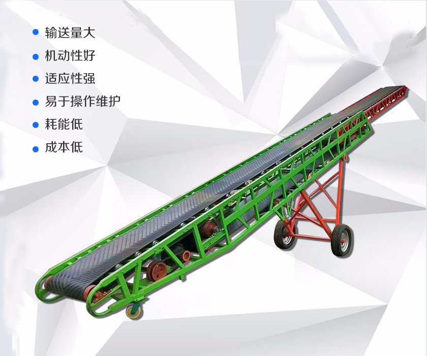 移動式皮帶輸送機(jī)是在普通皮帶輸送機(jī)底部安裝移動輪,大、小行走輪采用實(shí)心膠輪,防止壓碎糧食及倉庫地面,可以根據(jù)物料的堆放位置隨意移動,人工即可推動出入倉庫,主要用于裝卸地方變動的場合,如:砂石料場、建筑工地、煤場等。移動式皮帶輸送機(jī)有電動和手動升降兩種類型,具有快、慢兩種速度,以適應(yīng)散運(yùn)、包裝的不同要求??梢詥闻_或多臺串聯(lián)使用,也可與其他設(shè)備配套使用,具有輸送量大、機(jī)動性好、適應(yīng)性強(qiáng)、易于操作維護(hù)、耗能低、成本低等特點(diǎn)。