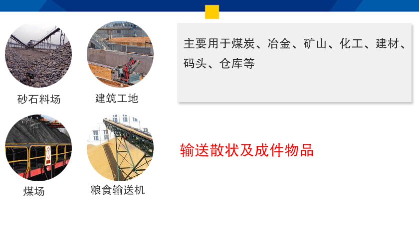 輸送帶:用來傳遞牽引力和承接輸送物料,材質(zhì)有橡膠帶和塑料帶兩種,還可根據(jù)輸送物料選擇其他材質(zhì)。