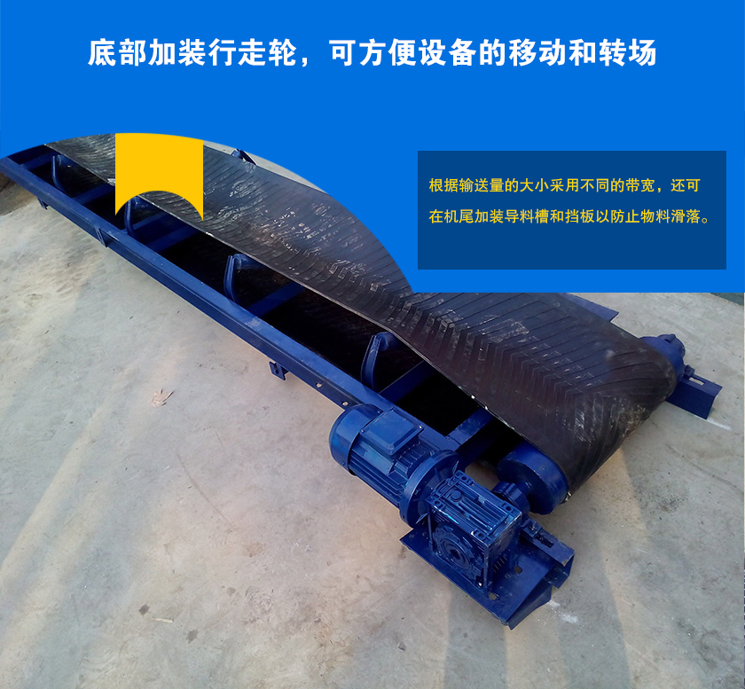 移動式皮帶輸送機(jī)是底部加裝了行走輪,移動方便,可根據(jù)現(xiàn)場向下輸送物料,也可用戶傾斜輸送,移動式皮帶輸送機(jī)可加裝擋料板來防止物料滑落.