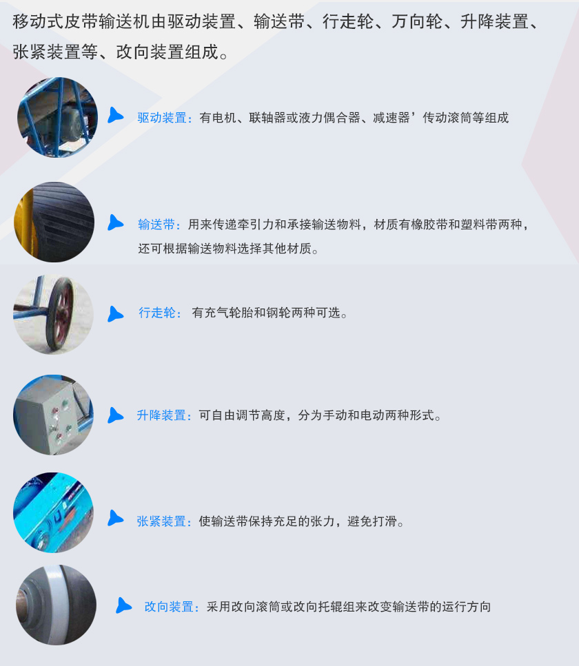 移動式皮帶輸送機(jī)由驅(qū)動裝置、輸送帶、行走輪、萬向輪、升降裝置、張緊裝置等、改向裝置組成。