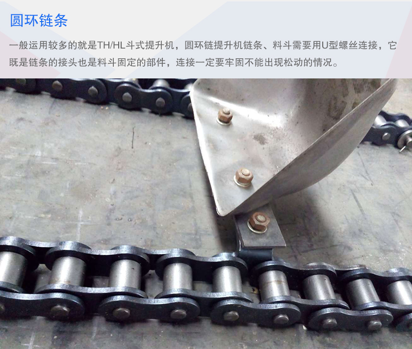 圓環(huán)鏈條:一般運(yùn)用較多的就是TH/HL斗式提升機(jī),圓環(huán)鏈提升機(jī)鏈條、料斗需要用U型螺絲連接,它既是鏈條的接頭也是料斗固定的部件,連接一定要牢固不能出現(xiàn)松動的情況。