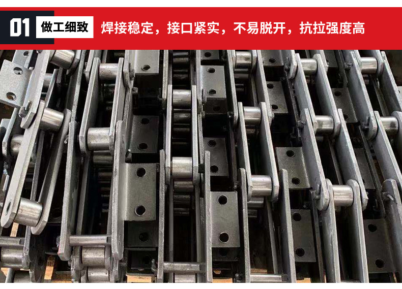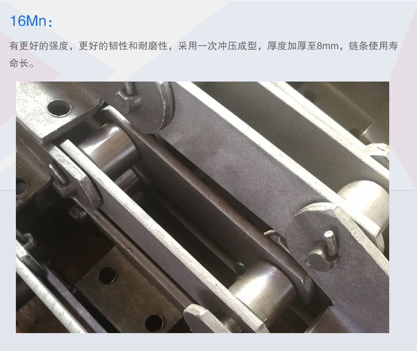 16Mn:有更好的強(qiáng)度,更好的韌性和耐磨性,采用一次沖壓成型,厚度加厚至8mm,鏈條使用壽命長。