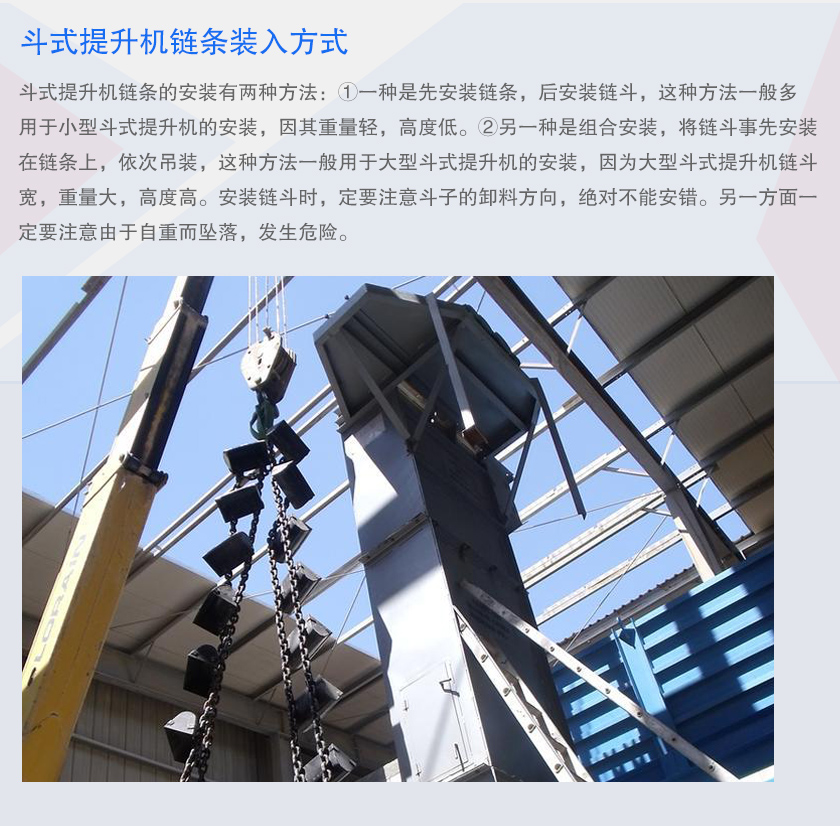 斗式提升機(jī)鏈條的安裝有兩種方法:①一種是先安裝鏈條,后安裝鏈斗,這種方法一般多用于小型斗式提升機(jī)的安裝,因其重量輕,高度低。②另一種是組合安裝,將鏈斗事先安裝在鏈條上,依次吊裝,這種方法一般用于大型斗式提升機(jī)的安裝,因?yàn)榇笮投肥教嵘龣C(jī)鏈斗寬,重量大,高度高。安裝鏈斗時,定要注意斗子的卸料方向,不能安錯。另一方面一定要注意由于自重而墜落,發(fā)生危險(xiǎn)。