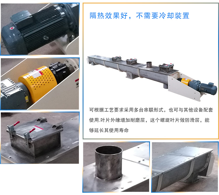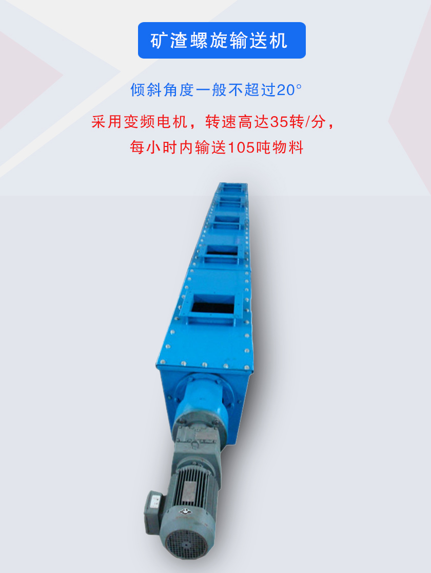 礦渣螺旋輸送機(jī)是由驅(qū)動(dòng)裝置、螺旋、頭部軸承、尾部軸承、懸掛軸承、機(jī)蓋、底座等組成。驅(qū)動(dòng)裝置:由電動(dòng)機(jī)、減速器、聯(lián)軸器等組成。螺旋軸與吊軸承、頭部軸承、尾部軸承聯(lián)接采用嵌入舌式,安裝拆卸不需軸向移動(dòng),維修方便,采用變徑結(jié)構(gòu),增大吊軸承處的容積,避免吊軸承與物料接觸,各傳動(dòng)部位采用浮動(dòng)聯(lián)接方式,頭尾軸承座均在殼體外,所有軸承采用多層密封和配合密封技術(shù),軸承使用壽命長。