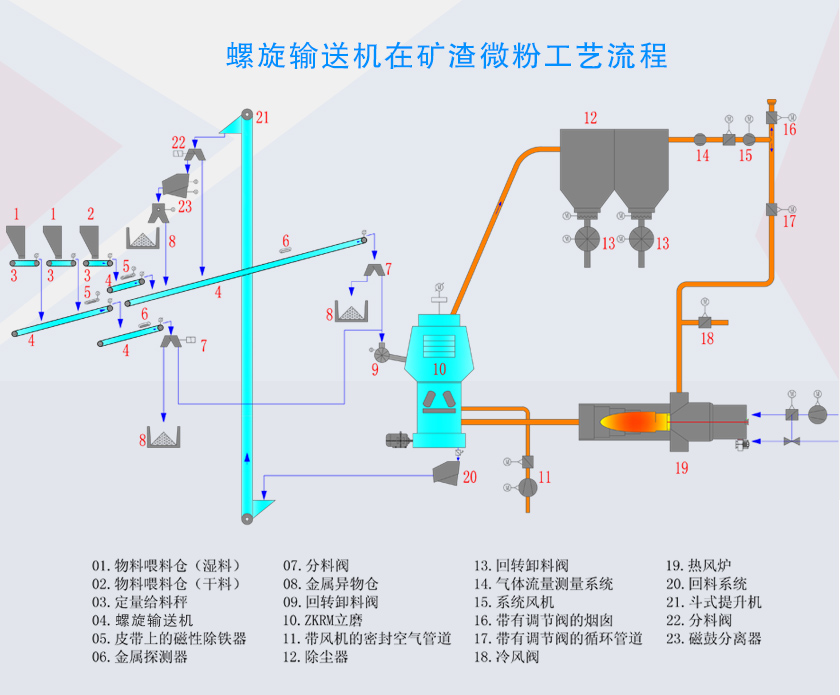 烘干后的磨渣進(jìn)入磨機(jī)進(jìn)行粉磨,粉磨出來的渣粉經(jīng)過選粉機(jī)進(jìn)行篩選后,與磨機(jī)渣粉由螺旋輸送機(jī)送回磨機(jī)繼續(xù)粉磨,與磨機(jī)形成閉路循環(huán),合格的渣粉有螺旋輸送機(jī)送至成品倉。