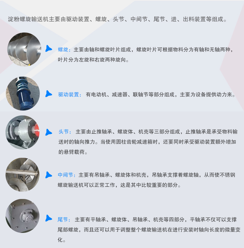 淀粉螺旋輸送機(jī)主要由驅(qū)動(dòng)裝置、螺旋、頭節(jié)、中間節(jié)、尾節(jié)、進(jìn)、出料裝置等組成。