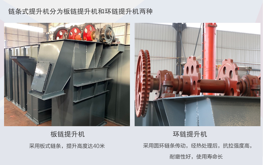 鏈條式提升機(jī)采用的是鏈條作為牽引構(gòu)件,分為板鏈提升機(jī)和環(huán)鏈提升機(jī)兩種,板鏈提升機(jī)采用板式鏈條,提升高度達(dá)40米,環(huán)鏈提升機(jī)采用圓環(huán)鏈條傳動,耐磨性好,使用壽命長.