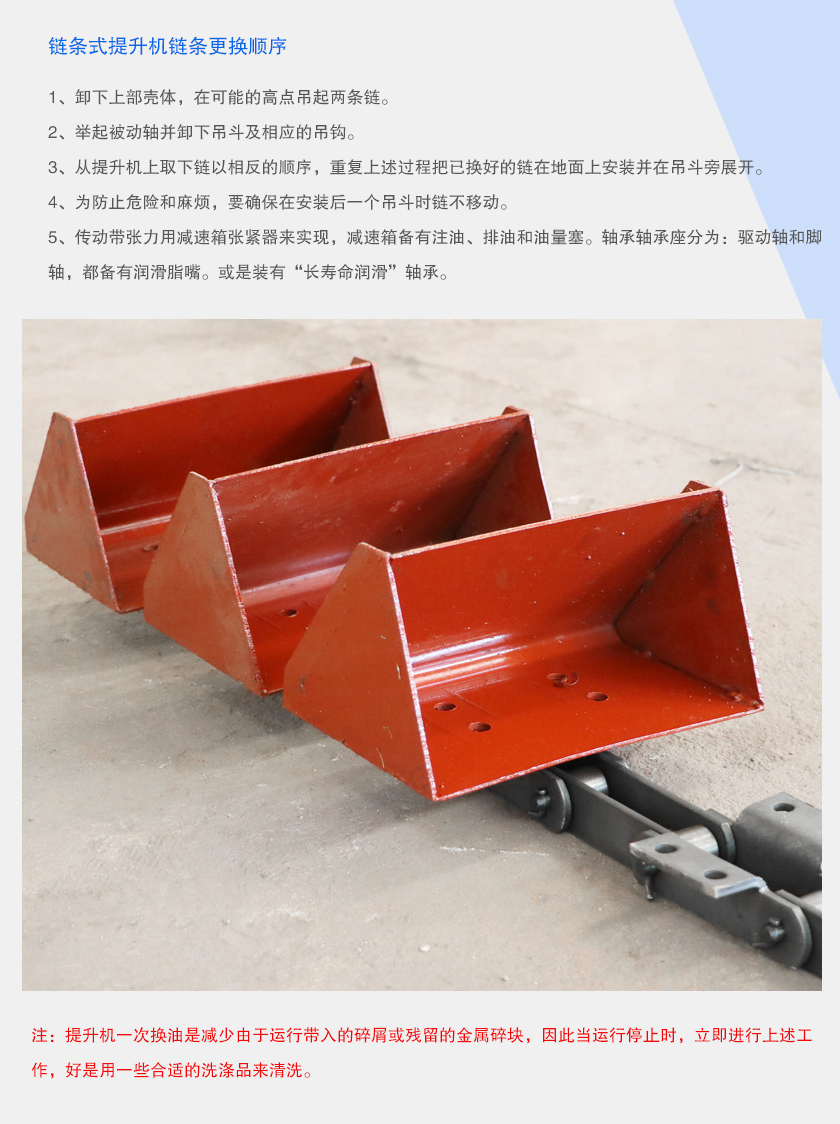 鏈?zhǔn)教嵘龣C(jī)可用于垂直輸送粉狀、顆粒狀及小塊狀的無磨琢性及磨琢性小的物料,如水泥、礦粉、石塊、沙子、化肥、糧食等。