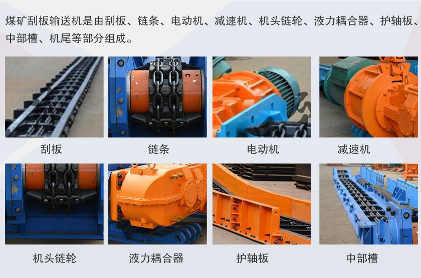 煤礦刮板輸送機(jī)是由刮板、鏈條、電動機(jī)、減速機(jī)、機(jī)頭鏈輪、液力耦合器、護(hù)軸板、中部槽、機(jī)尾等部分組成。