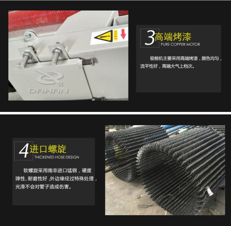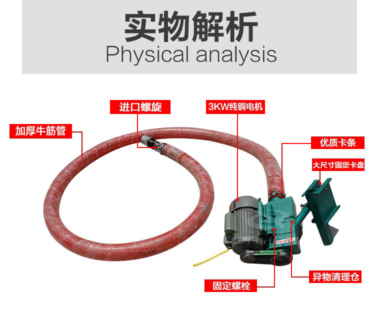 糧食的收購入車的操作,該絞龍具有省時、省力、省人工的功效。而且重量輕,有兩個人操作可以了,加進了糧食收購過程,大大節(jié)省了時間,受到了廣大糧食收購者的歡迎!糧食用吸糧機機:便捷式抽糧器,本機器具有體積小、功率大、攜帶方便等特點,全國少見生產(chǎn)新型產(chǎn)品。機器使用電源220V(兩相電可操作),機身長度8米,每小時抽糧10-12噸,機器重量75公斤,適合下鄉(xiāng)抽糧使用,能使您減輕人工負(fù)擔(dān)。省工省時省力,下鄉(xiāng)抽糧神器。使用220V電壓和380V電壓兩種,簡單實用,設(shè)計合理,體積小,每小時提升6噸糧食,直接卡在貨車箱的加高壁上就可以了,可彎曲可移動,可分體,攜帶方便,是各種糧食作物裝車、卸車、出庫、入庫等的好設(shè)備,即省工又省力