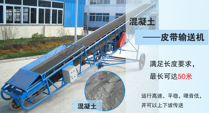 皮帶輸送機(jī)具有輸送能力強(qiáng),輸送距離遠(yuǎn)(可達(dá)50米),結(jié)構(gòu)簡單易于維護(hù),能方便地實行程序化控制和自動化操作。帶式輸送機(jī)主要由兩個端點滾筒及緊套其上的閉合輸送帶組成 。運(yùn)用輸送帶的連續(xù)或間歇運(yùn)動來輸送100KG以下的混凝土,其運(yùn)行高速、平穩(wěn),噪音低,并可以上下坡傳送。