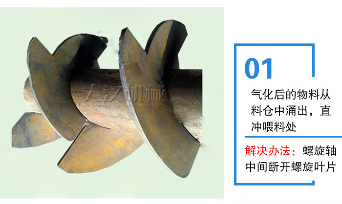 沖料原因3:螺旋葉片加工不當絨磨損,使得兩者之間的間隙過大,粉料便從其底部間隙流向出料口。