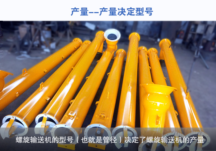 螺旋輸送機(jī)的型號(hào)(也就是管徑)決定了螺旋輸送機(jī)的產(chǎn)量,輸送產(chǎn)量越大,螺旋輸送機(jī)選擇的型號(hào)越就餓越大。