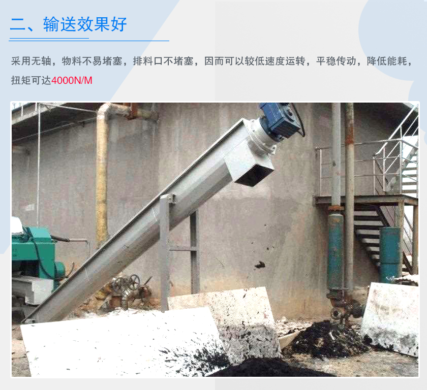 無軸螺旋輸送機由于采用無軸,物料不易堵塞,排料口不堵塞,因而可以較低速度運轉,平穩(wěn)傳動,降低能耗,扭矩可達4000N/m,輸送量是相同直徑傳統(tǒng)有軸螺旋輸送機的1.5倍,單機輸送長度可達60米。并可根據(jù)用戶需要,采用多級串聯(lián)式安裝。
