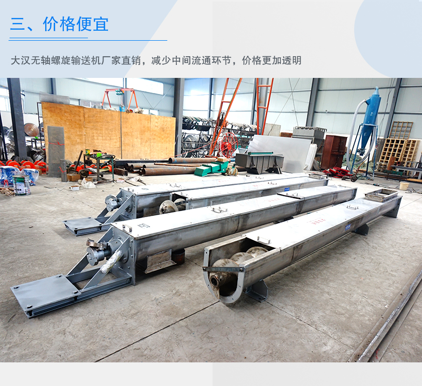 大漢無軸螺旋輸送機廠家直銷,減少中間流通環(huán)節(jié),價格更加透明,廠家位于河南省新鄉(xiāng)市,生產(chǎn)成本較北京、上海等地會更加便宜,所以無軸螺旋輸送機價格也會更低。