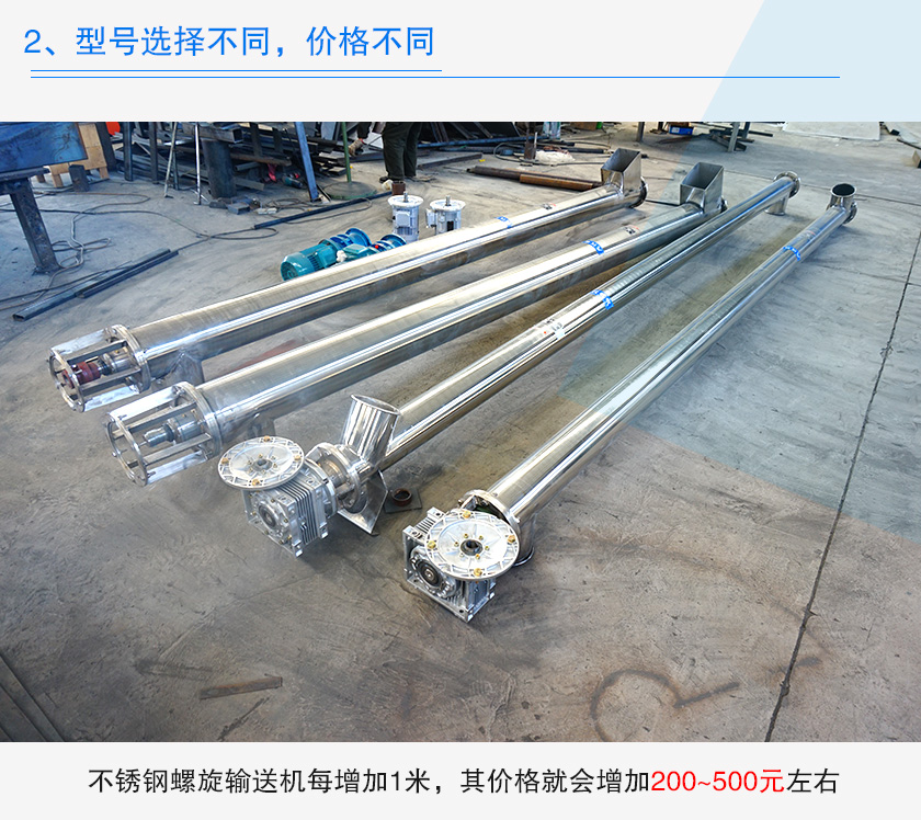 不銹鋼螺旋輸送機(jī)直徑從100~1250mm之間,選擇不同直徑的設(shè)備對(duì)于輸送量是有影響的,輸送量越大,選擇的管徑就越大,其價(jià)格就會(huì)越高,而且選擇的設(shè)備長(zhǎng)度不同,其價(jià)格越會(huì)有所變化,不銹鋼螺旋輸送機(jī)每增加1米,其價(jià)格就會(huì)增加200~500元左右。