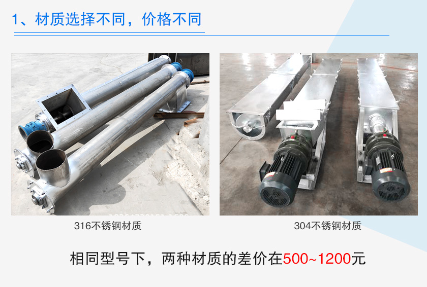 不銹鋼螺旋輸送機(jī)選擇的不銹鋼材質(zhì)一般包含304、316兩種,選擇不同材質(zhì),其價(jià)格會(huì)存在差異化,316不銹鋼材質(zhì)會(huì)比304不銹鋼材質(zhì)耐腐蝕,能抵抗更高的溫度,當(dāng)然在制造成本上也會(huì)更高,相同型號(hào)下,兩種材質(zhì)的差價(jià)在500~1200元。