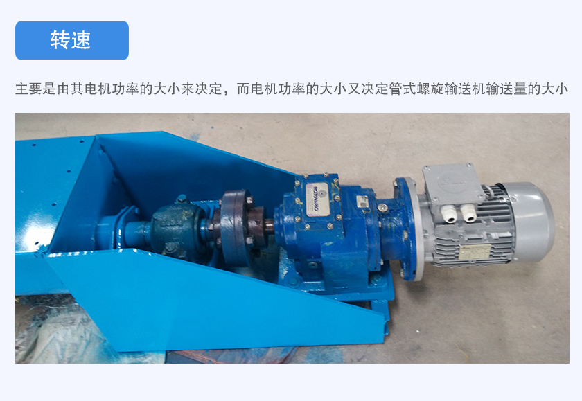 管式螺旋輸送機轉速主要是由其電機功率的大小來決定,而電機功率的大小又決定管式螺旋輸送機輸送量的大小,如果電機功率過小,會導致物料在管內的運行速度變慢,減低輸送效率,嚴重情況下還會導致電機燒毀。如果電機功率過大,會耗電量上升,增加企業(yè)運行成本。
