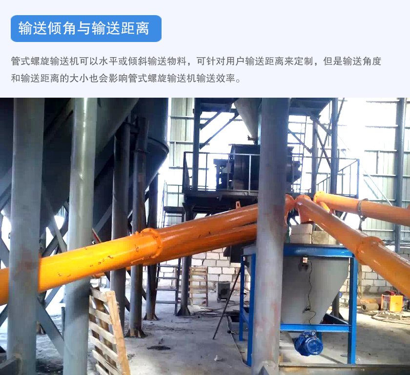 管式螺旋輸送機可以水平或傾斜輸送物料,可針對用戶輸送距離來定制,但是輸送角度和輸送距離的大小也會影響管式螺旋輸送機輸送效率。
